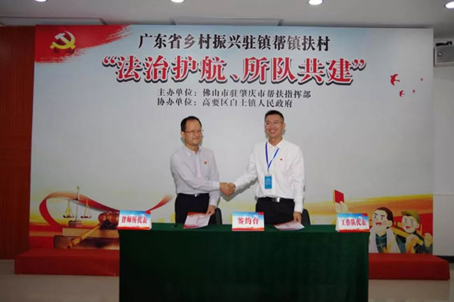 由指挥部与佛山市司法局共同牵头组织,各部门积极响应,从佛山市优选出10家律所与肇庆10个重点帮扶镇结对共建,每年开展“六个一”活动,为乡村振兴驻镇帮镇扶村工作提供法律服务和法治保障。